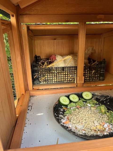 Im Hühnerstall in Falkenrehde ist der Hahn Lukas der Herr der Hühnergemeinschaft und achtet auf seine Damen. in Falkensee sind nur Hennen zusammen. Nun ergab es sich, dass eine der Hennen in Falkensee „gegluckt“ hat. Es gab deutliche Kennzeichen, dass sie brüten wollte. Da die Eier in Falkensee nicht befruchtet sind, haben wir ihr 8 befruchtete Eier aus Falkenrehde ins Nest gelegt. Sie bekam einen gesicherten Ort in einem separaten kleinen Häuschen und saß auf ihren Eiern.
